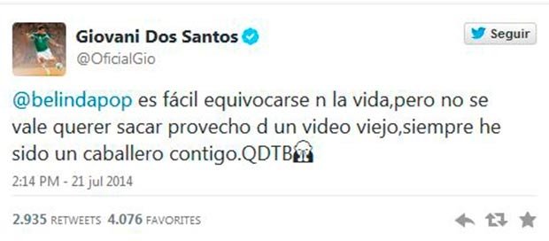 Al parecer la cantante Belinda, con quien mantuvo un noviazgo entre 2008 y 2009, compartió el video, situación ante la que reaccionó el futbolista enviándole un tuit en el que se lee: «Es fácil equivocarse en la vida, pero no se vale querer sacar provecho de un video viejo, siempre he sido un caballero contigo. QDTB».